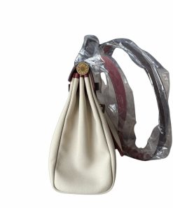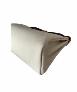 NewThis bag is crafted of toile militaire and vache hunter with beton, rouge sellier color. The handbag feature a rear exterior zip pocket, a natural leather top crest with a leather top handle, shoulder strap and strap closure with gold hardware.