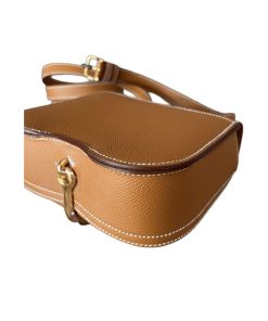 This Hermes Della is the modern design and the unique curved saddle silhouette is enhanced with a flap closure by a gold clasp. The bag is crafted of epsom leather in cavalleria gold color.