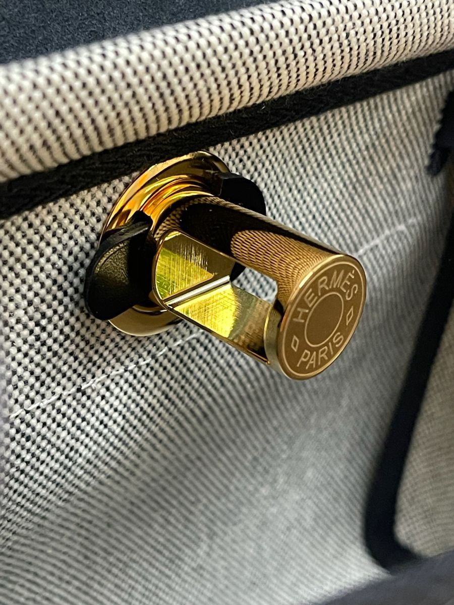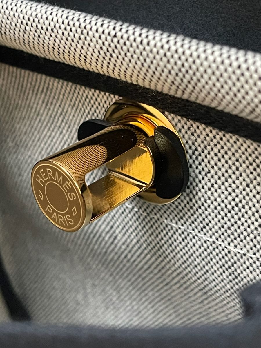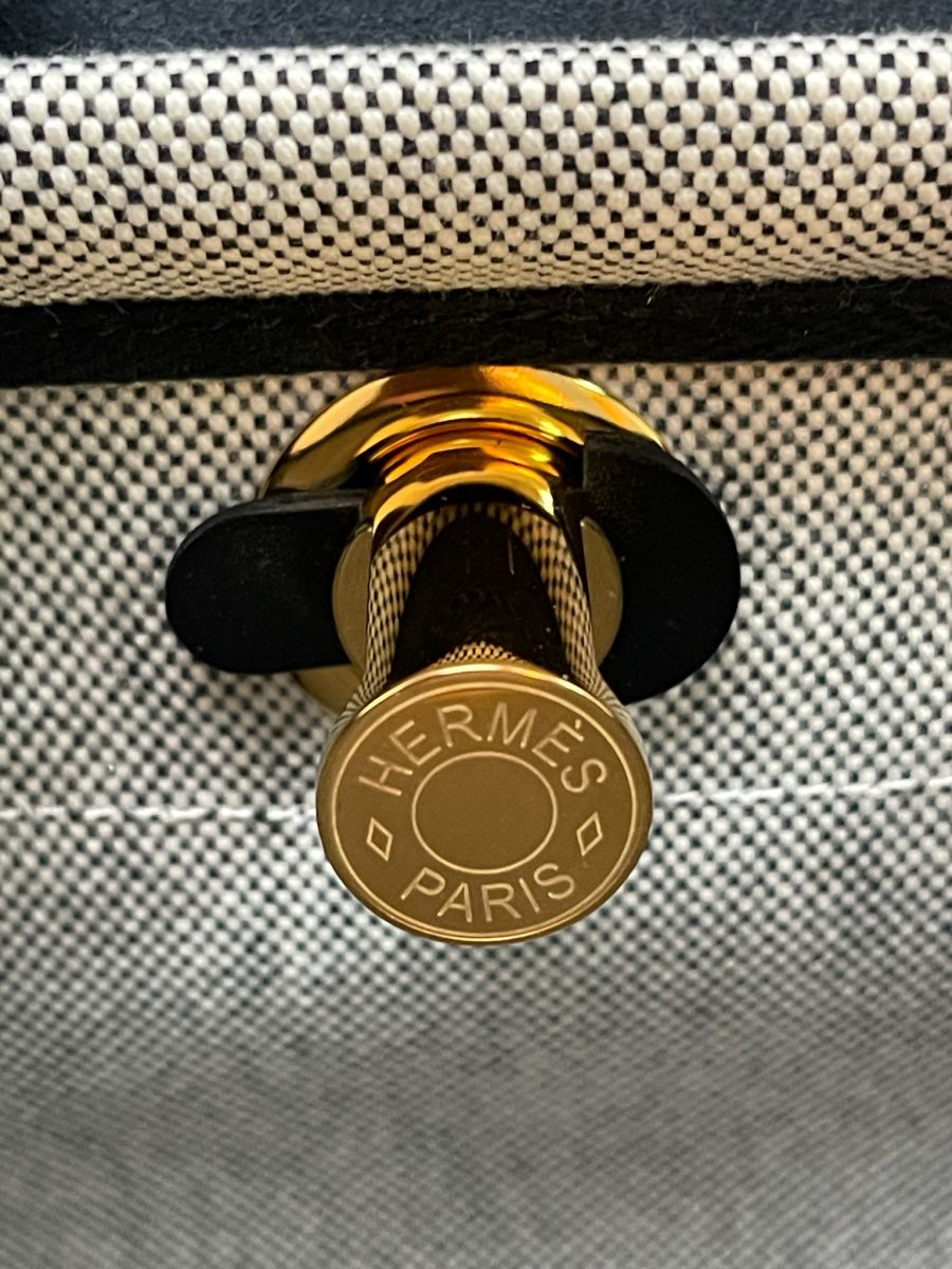 Model: HerbagColor: BlackSize: MiniMeasurement: 20cm x 17cm x 7cmHardware: Gold HardwareLeather: Toile, Vache HunterStamp/ Year/ Collection: Stamp KComes With: Full set with original receiptCondition