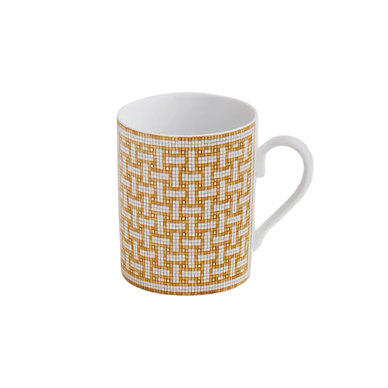 This mug is made of porcelain, mosaique are screen printed and using gold tiles.